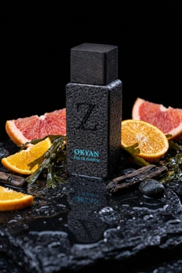 The ocean speaks first. Grapefruit flashes like sunlight on waves, marine air crashes clean and cold. Beneath the surface, moss and dark woods hold steady, strong as the tide. OKYAN.